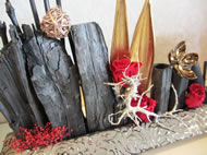 炭を使ってプリザードフラワーとアレンジされた作品も展示しております(垣内様作品)