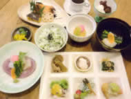 前菜盛り・鮭味噌西京焼き・粟麩の田楽・お刺身・セリ御飯・アサリとしんじょうのお吸い物・新じゃが饅頭・お漬物・白玉ぜんざい・コーヒー